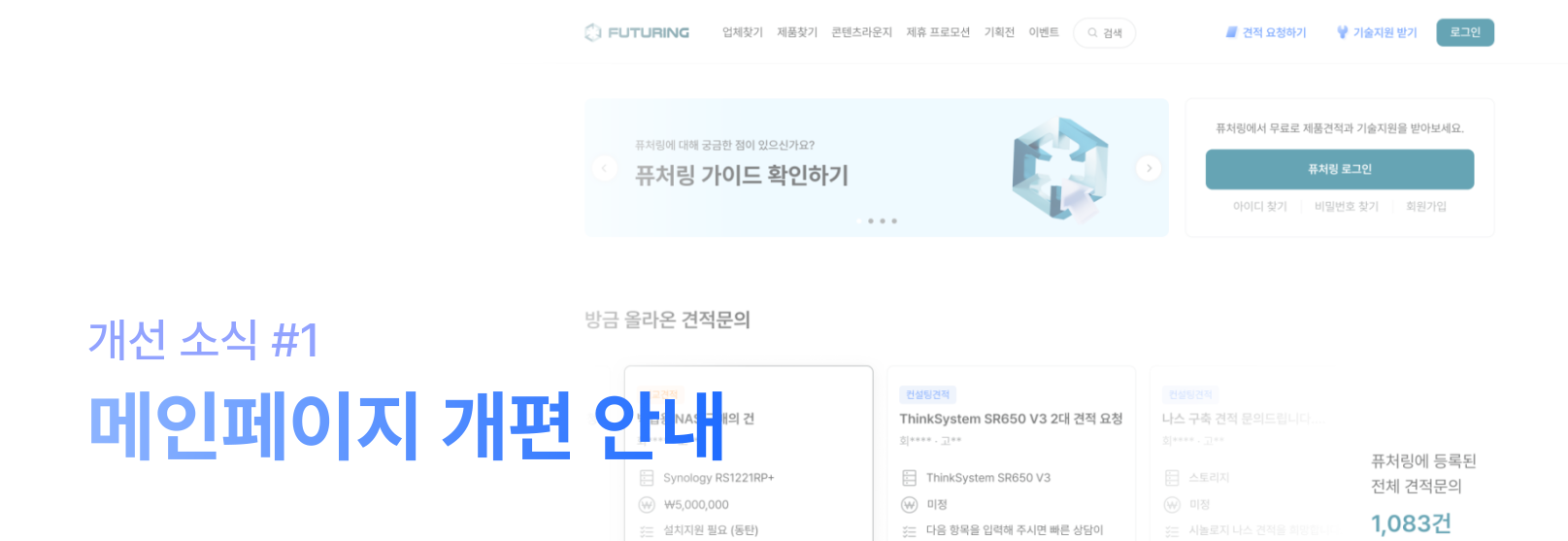 퓨처링은 신뢰할 수 있는 B2B IT 커머스 플랫폼이지만, 기존 메인페이지에서는 이 점을 충분히 전달하지 못했어요. 그래서 이번 업데이트에서는 고객 후기, 요청 사례, 서비스 정보를 시각적으로 강조해, 퓨처링이 어떤 서비스를 제공하며 얼마나 신뢰할 수 있는지를 명확하게 전달하도록 개선했어요.